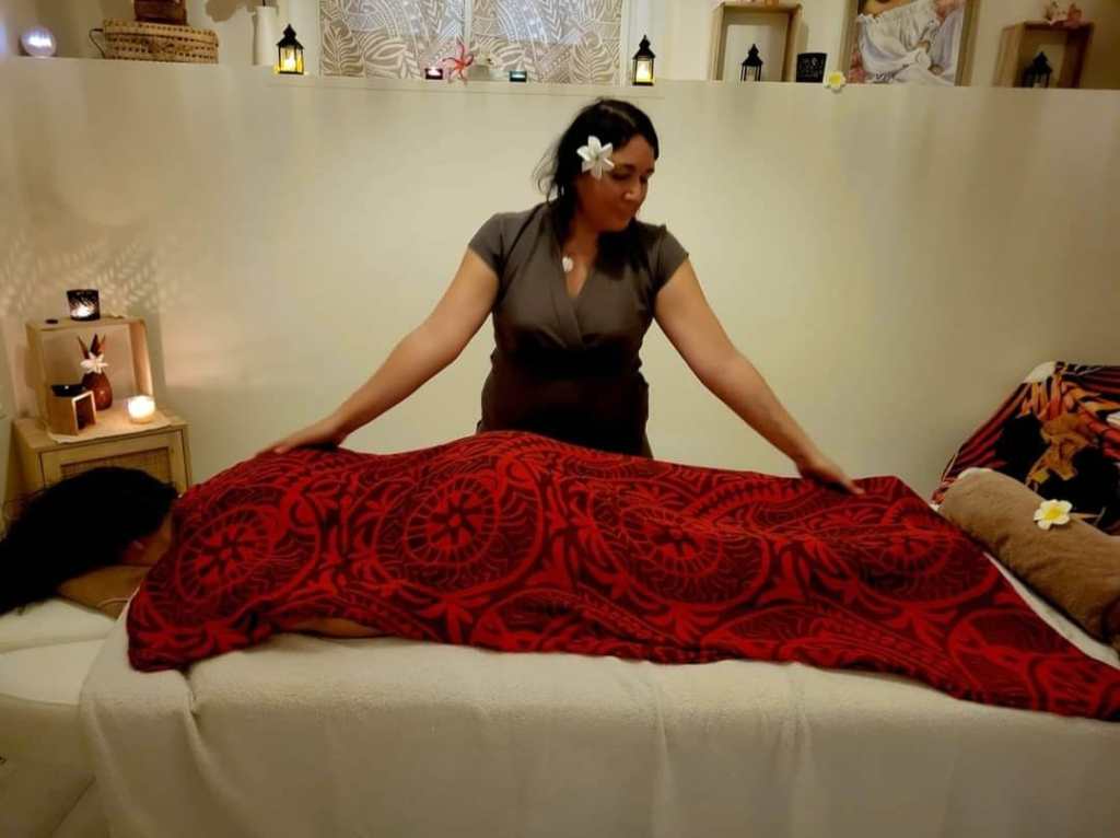 Pendant que l’un reçoit son soin, l’autre se détend autour d’un thé et découvre l’univers polynésien à travers des livres mis à disposition.